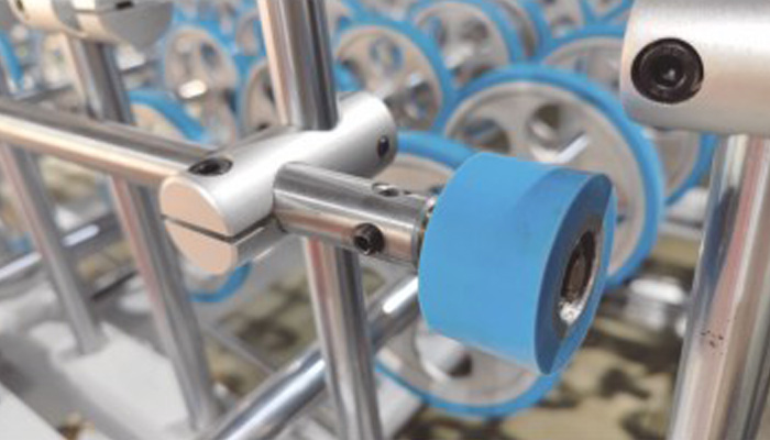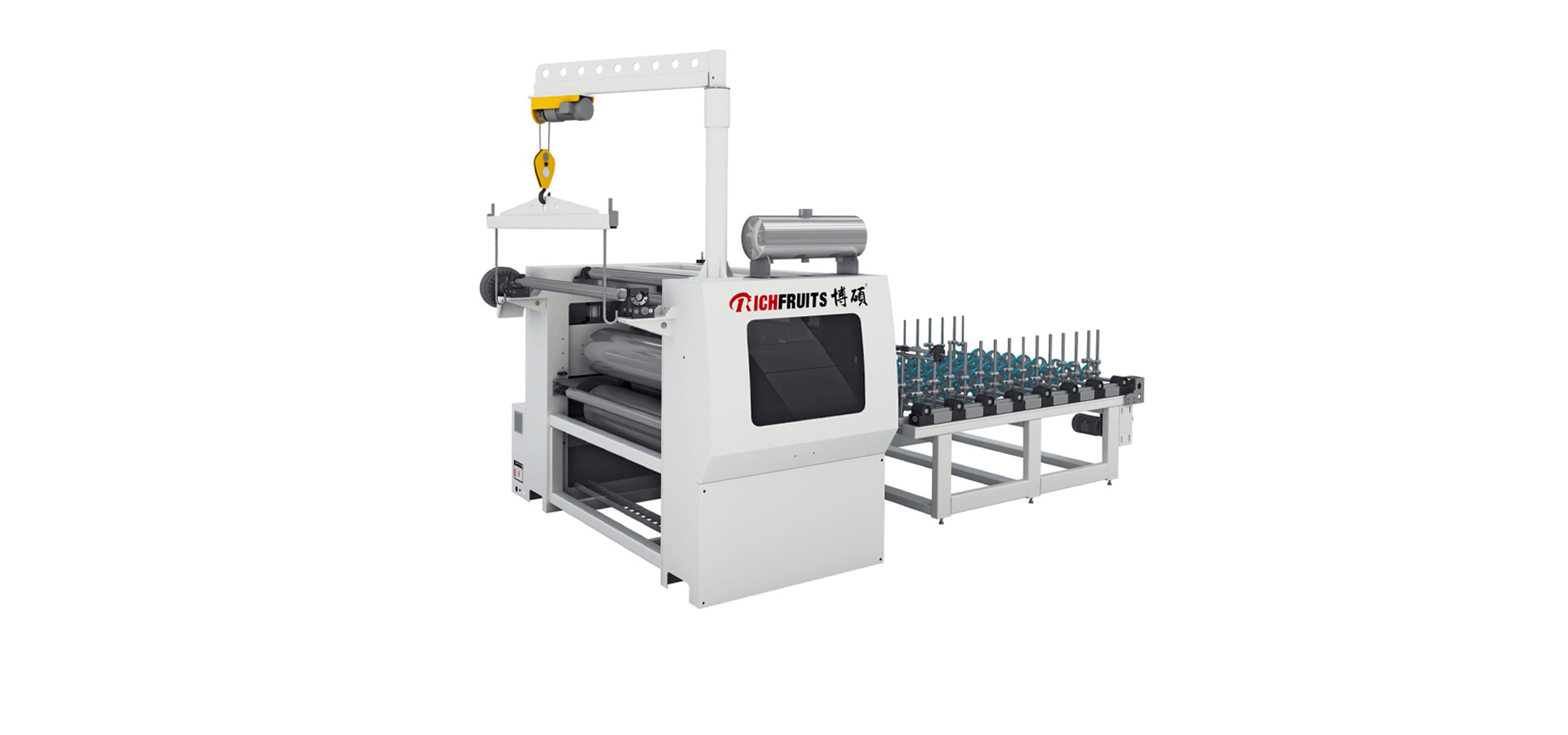 配置兩輥壓貼輥,一組膠輥和一組鋼輥;配膜張緊裝置;配電動吊葫蘆,實(shí)現(xiàn)膜吊裝上線;包覆輥可整體單邊調(diào)節(jié)移動,快速調(diào)整尺寸。