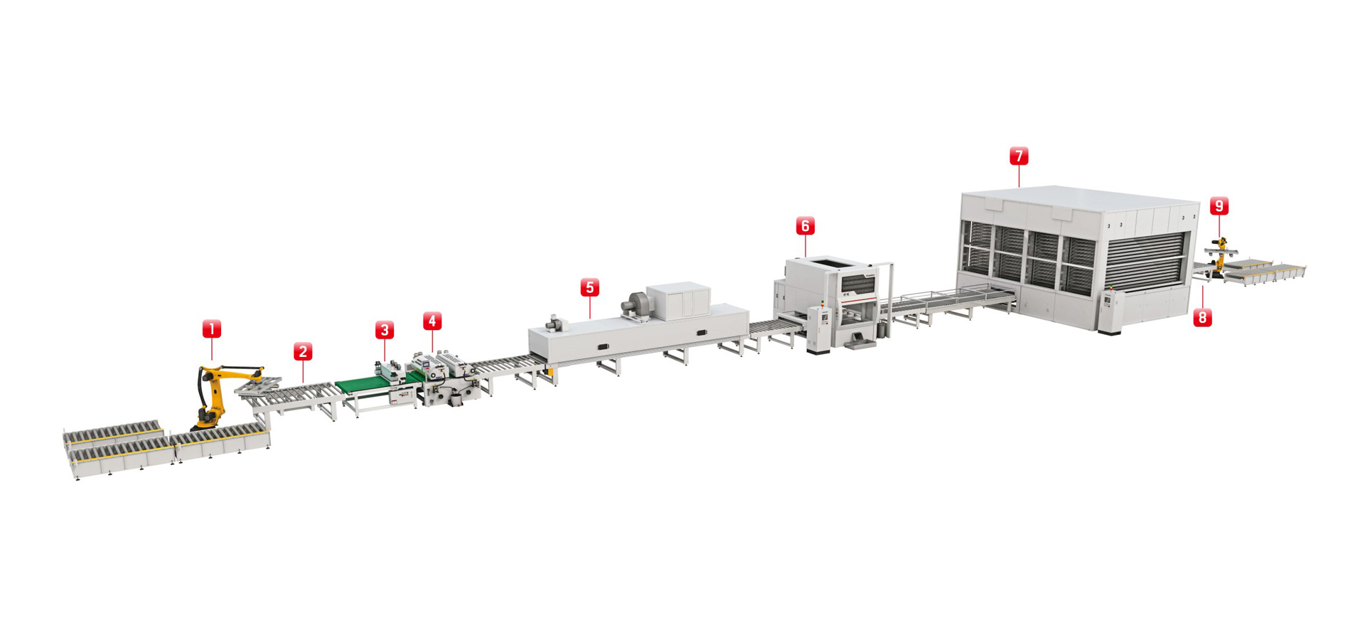 預(yù)輥實(shí)色乳膠中涂,再噴涂真石漆沙粒效果,避免了透底的現(xiàn)象。后段配平鋪式立體干燥房,避免了厚噴漆膜流掛的現(xiàn)象,同時(shí)實(shí)現(xiàn)油漆快速干燥,將能耗降至最優(yōu)。
