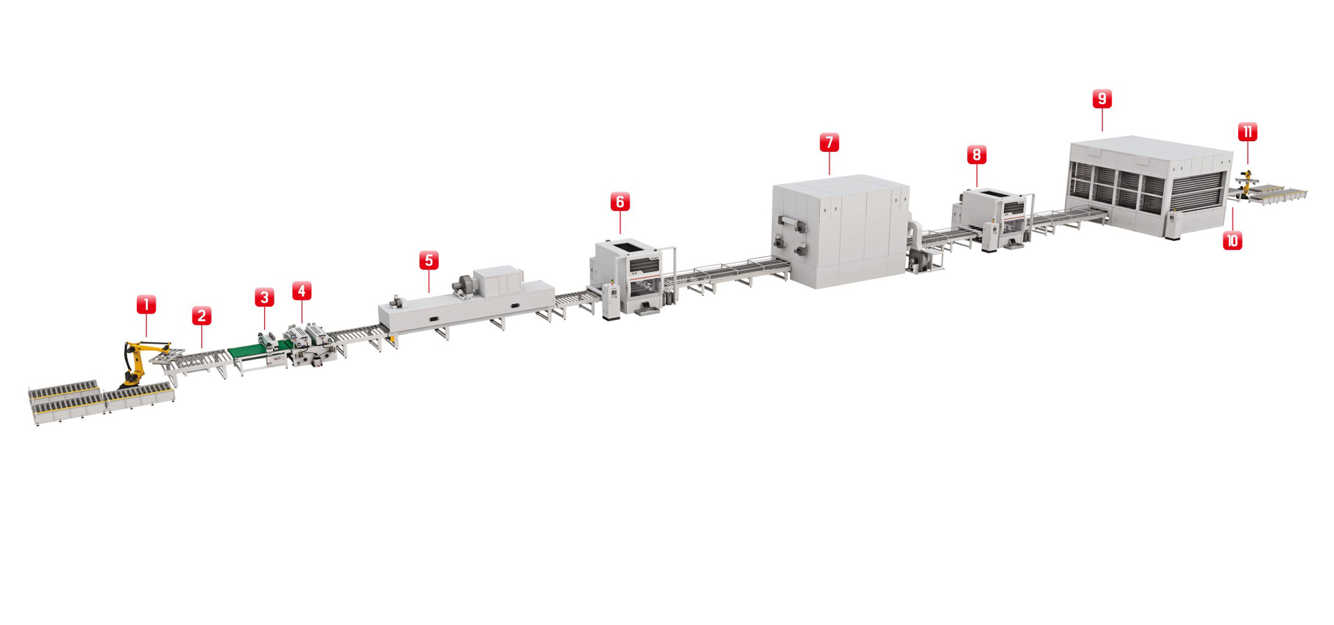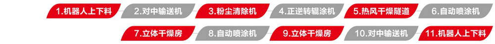 預(yù)輥實(shí)色水性中涂,再通過兩次水包水薄噴待干的工藝配合,一來將色差降至最低,二來避免底層漆膜水份透不來形成假干的現(xiàn)象。后段配平鋪式立體干燥房,避免了厚噴漆膜流掛的現(xiàn)象,同時實(shí)現(xiàn)油漆快速干燥,將能耗降至最優(yōu)。