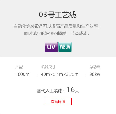 工藝要求 無(wú)溶劑UV底漆 產(chǎn)品種類 衛(wèi)浴柜 產(chǎn)線數(shù)量 1條 設(shè)備特色 UV底漆快速干燥 生產(chǎn)產(chǎn)能 UV底漆線:1800m2/8h (生產(chǎn)員3人/線) 廢氣處理 干式過(guò)海+光氧催化+活性碳 -