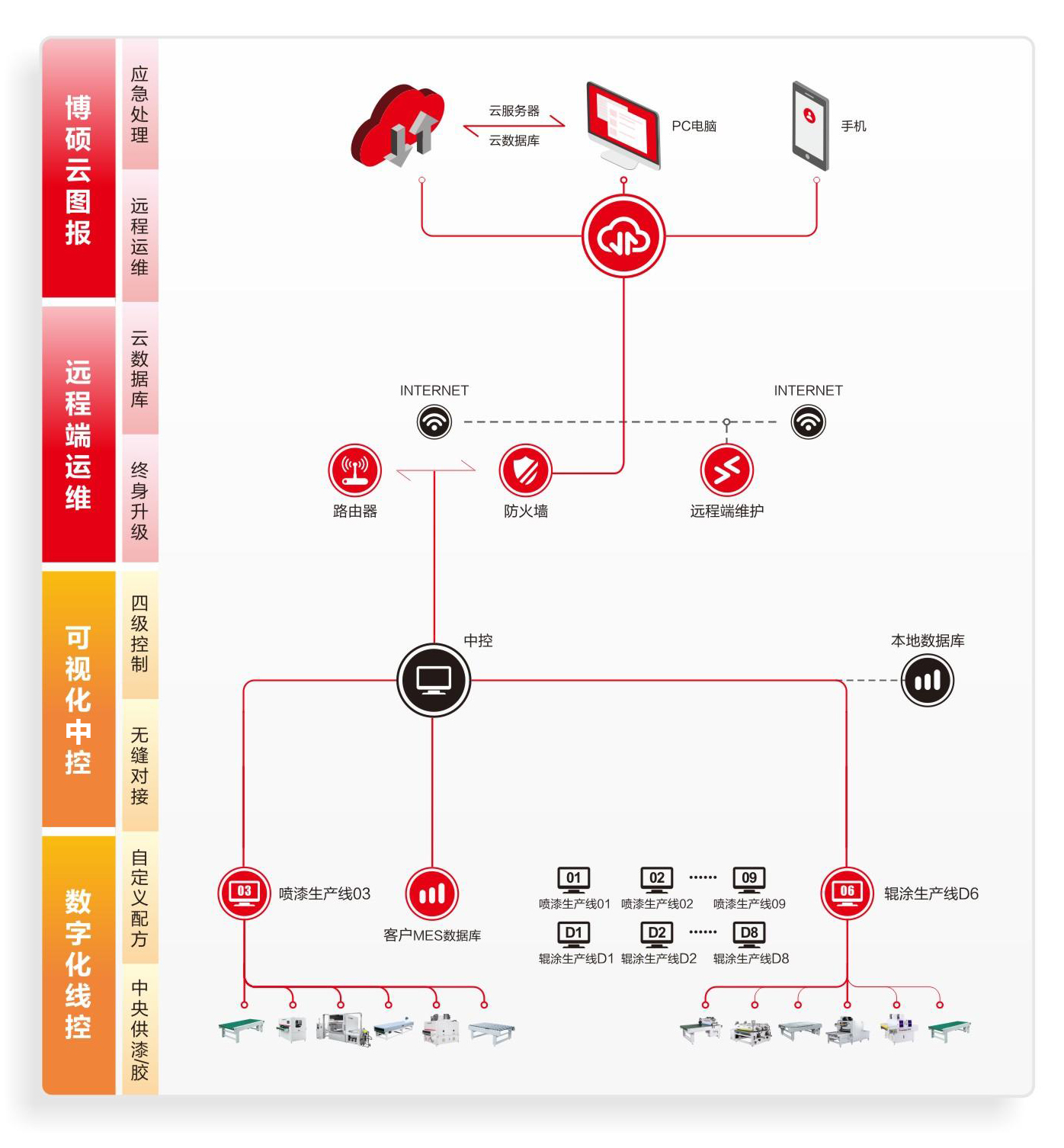 此次博碩涂裝一體化解決方案2.0升級的創(chuàng)新重點,也是和上一代最大的不同,便是“數字化云服務”,它包括:數字化線控、可視化中控、遠程端運維、博碩云圖報,是一整套完整的數字化、智能化體系。