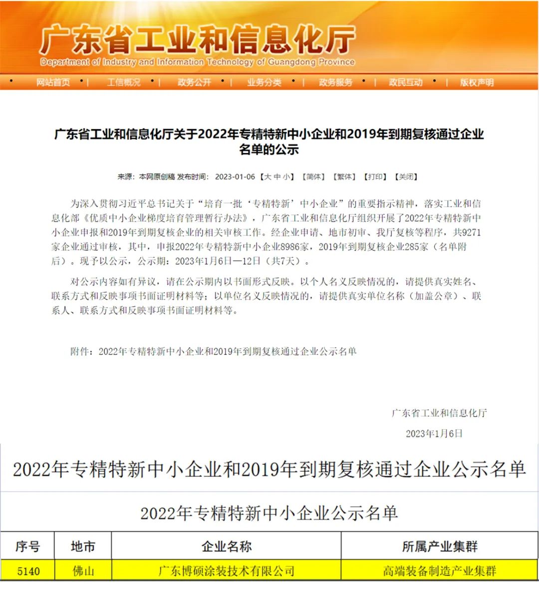 2023年1月6日,廣東省工業(yè)和信息化廳發(fā)布《關(guān)于2022年專精特新中小企業(yè)名單的公示》。經(jīng)過企業(yè)自主申報(bào)、嚴(yán)格審查、專家評選、審核等程序,廣東博碩涂裝技術(shù)有限公司正式通過認(rèn)定入選為:2022年廣東省“專精特新”中小企業(yè)。