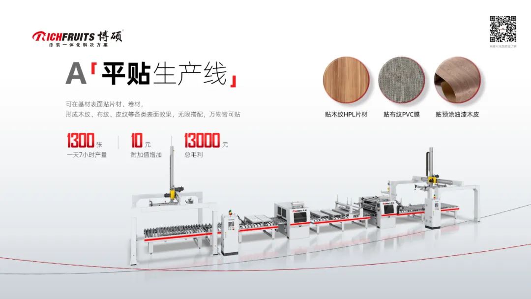 A線:平貼生產(chǎn)線,這工藝相對(duì)簡(jiǎn)單且投資門檻較低的一條產(chǎn)線,可在基材表面貼上各種膜或片材,做成千種效果,甚至貼上預(yù)涂好油漆的木皮,總之萬物皆可貼;別看我說他工藝簡(jiǎn)單,但是產(chǎn)量可不簡(jiǎn)單,一天7小時(shí)產(chǎn)量是1300張48尺板,增加飾面效果后的每張板附加值增加10元, 那么一天毛利是13000元;當(dāng)然這個(gè)是我們估算的理想狀態(tài)下的數(shù)據(jù),作為參考。