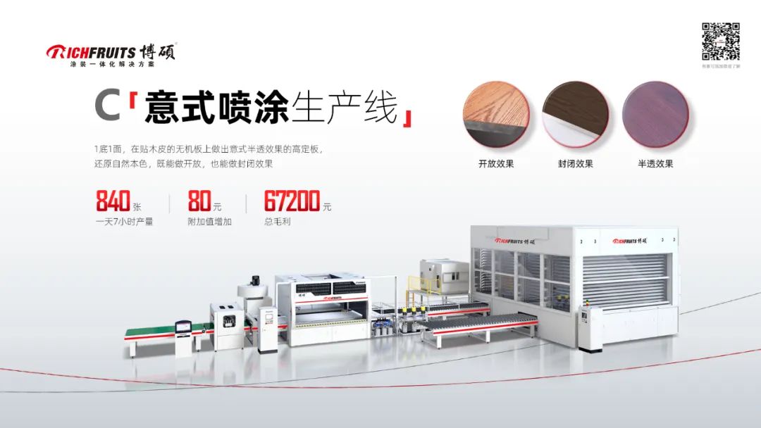 C線:在貼木皮的無機(jī)板上通過噴涂的方式做出意式半透效果的高定板,能夠還原自然本色,既能做開放,也能做封閉效果。這條線的最大特點(diǎn):一鍵換色,一分鐘完成噴槍清洗,柔性化程度高,高定和批量工程都能通用。一天7小時(shí)產(chǎn)量是840張48尺板,每塊板的毛利大概是80元, 一天毛利是67200元。