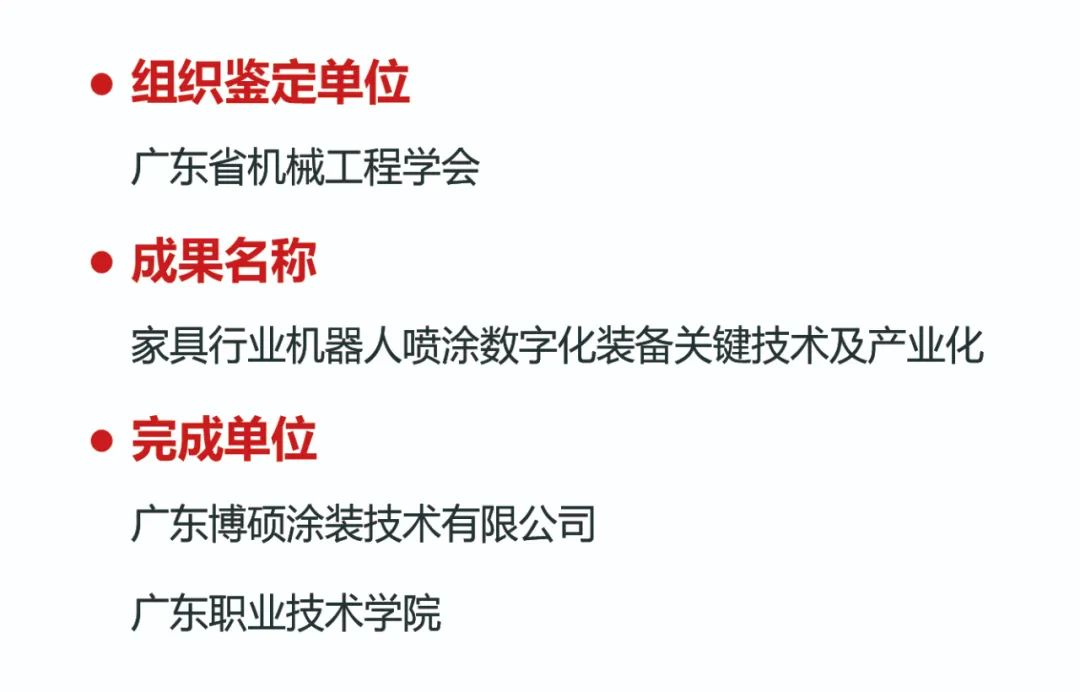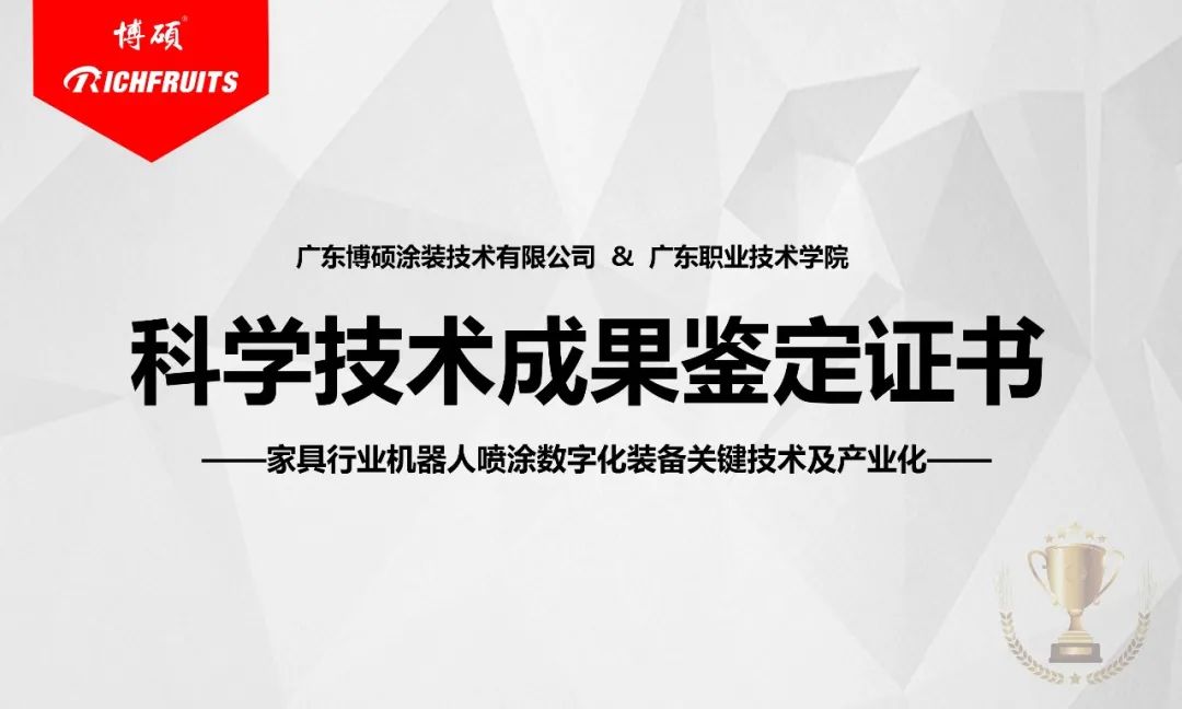 熱烈祝賀博碩“家具行業(yè)機(jī)器人噴涂數(shù)字化裝備關(guān)鍵技術(shù)及產(chǎn)業(yè)化”項(xiàng)目成果達(dá)到國際先進(jìn)水平通過科技成果鑒定!
