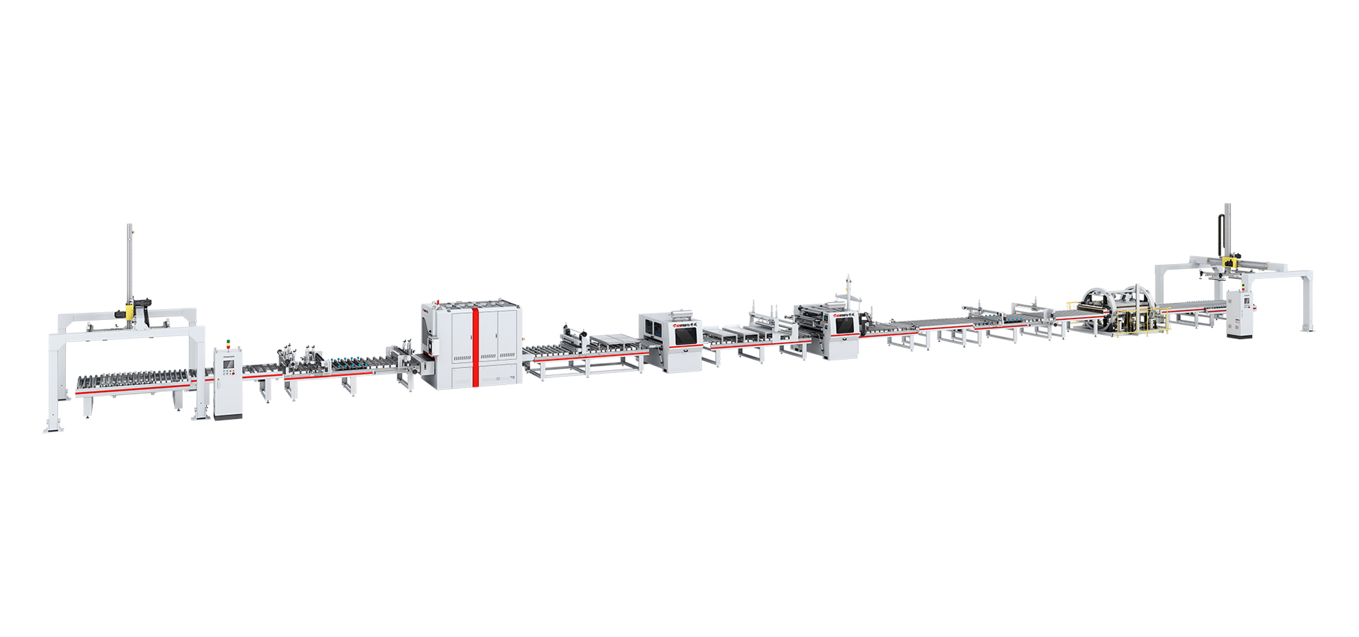 本生產(chǎn)線由:龍門上下料機(jī) — 對(duì)中輸送機(jī) — 輸送機(jī) — 倒角機(jī) — 砂光機(jī) — 粉塵清除機(jī) — PUR涂膠機(jī)(含溶膠系統(tǒng)) — 恒溫隧道 — 平貼機(jī) — 斜切機(jī) — 輸送機(jī) — 精密修邊機(jī) — 輸送機(jī) — 圓筒式翻板機(jī) — 輸送機(jī) — 對(duì)中輸送機(jī) — 龍門上下料機(jī)等部分組成。