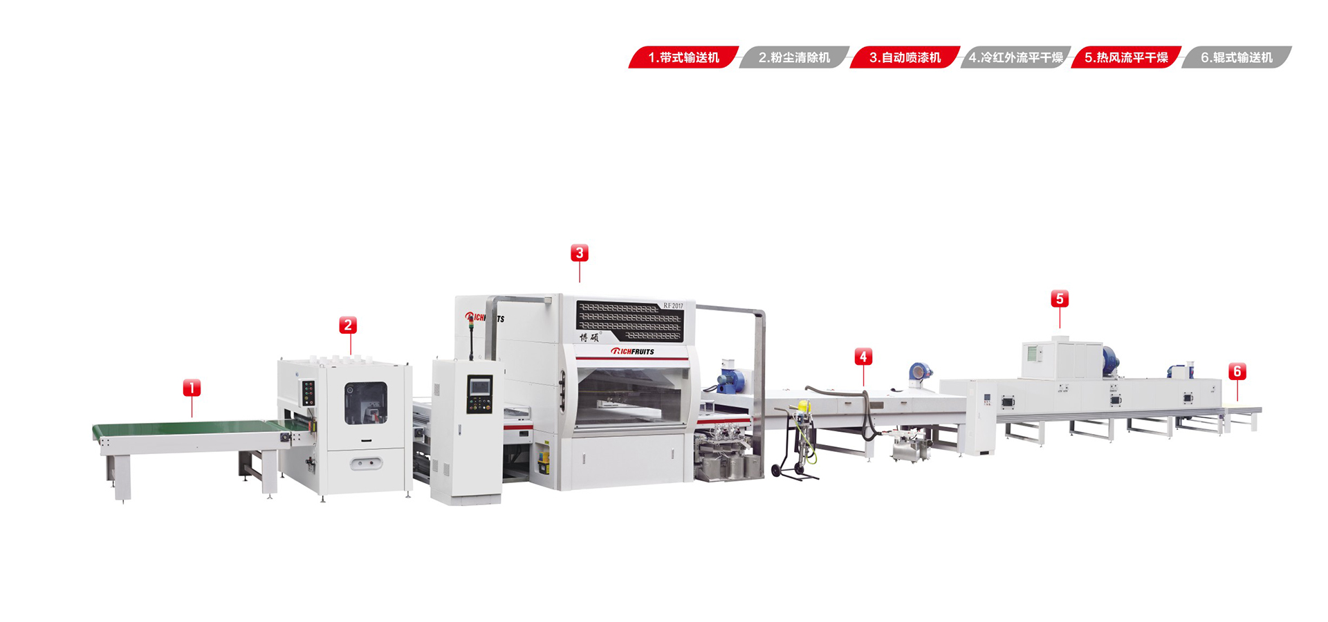 適用于板式家具、實木門、櫥柜門、工藝品、裝飾板、硅酸鈣板、玻鎂板、水泥纖維板的板式加工件的平面和四個側(cè)邊進行高質(zhì)量、大批量連續(xù)噴漆。