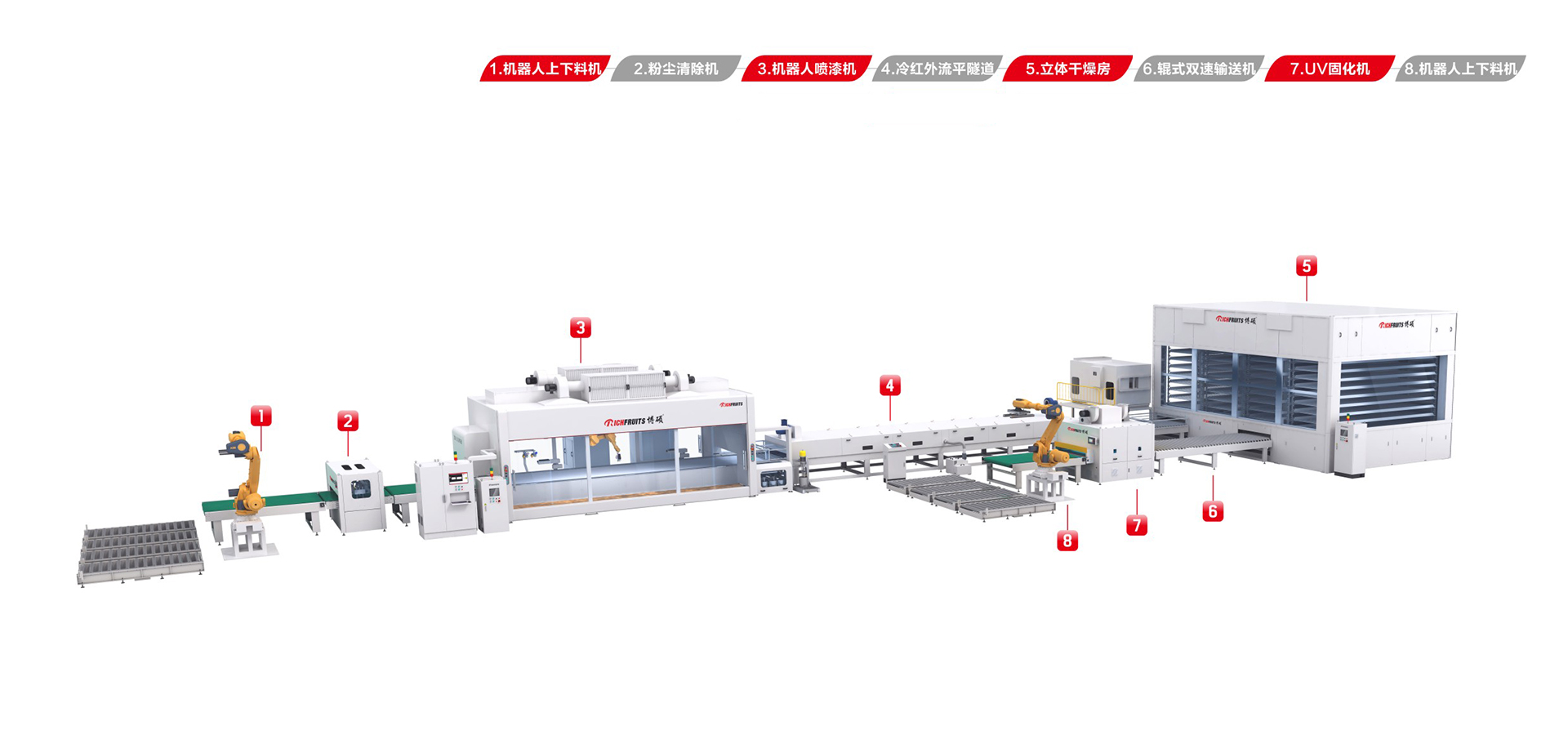 適用于板式家具、實(shí)木門(mén)、櫥柜門(mén)、工藝品、裝飾板、硅酸鈣板、玻鎂板、水泥纖維板的板式加工件的平面和四個(gè)側(cè)邊進(jìn)行高質(zhì)量、大批量連續(xù)噴漆。