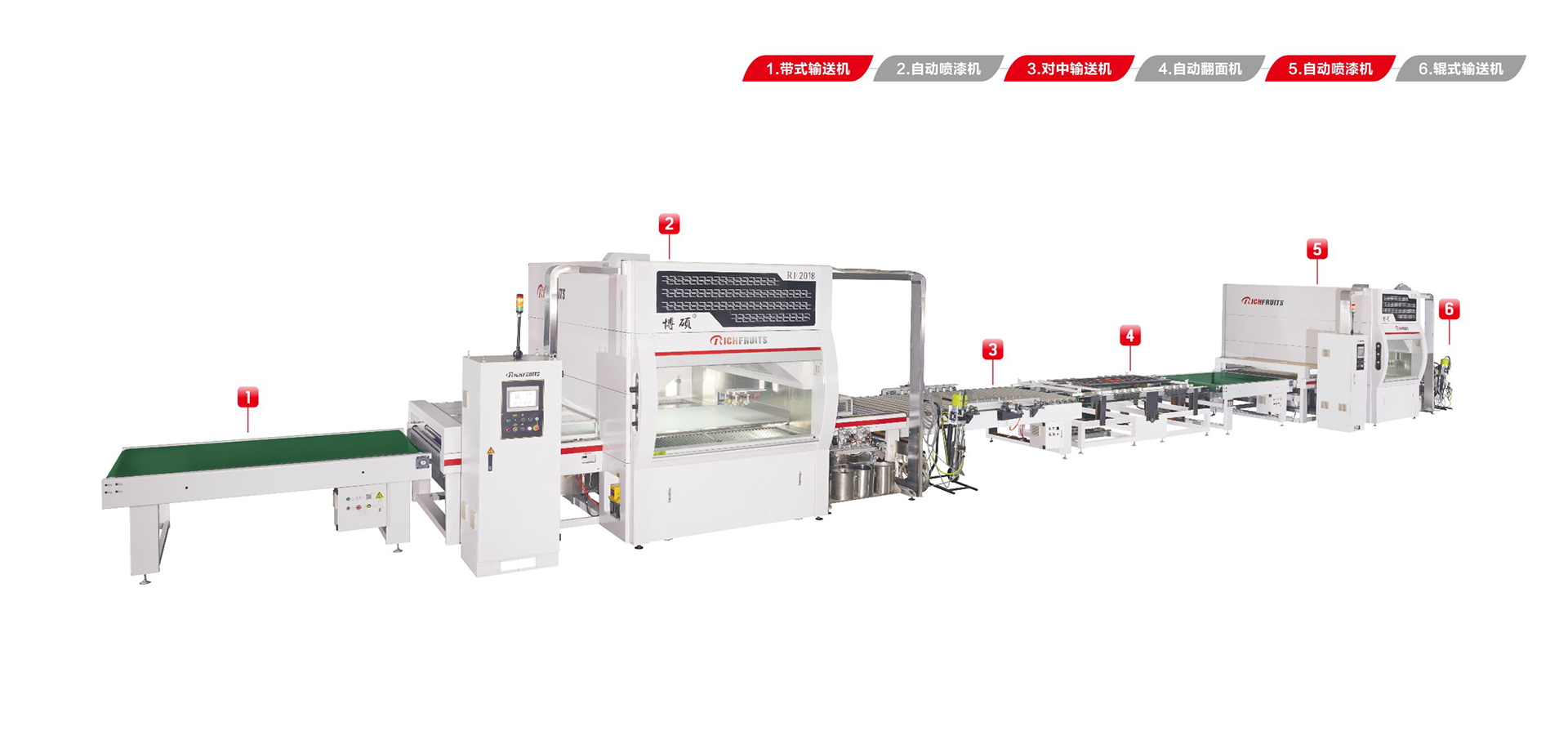 082500mm自動(dòng)噴漆線配置兩臺(tái)噴漆機(jī)和一臺(tái)自動(dòng)翻面機(jī)。雙機(jī)一次完成噴涂,可以噴涂PU漆、NC漆和水性漆,是自動(dòng)化程度高、產(chǎn)量大、應(yīng)用穩(wěn)定的設(shè)備。