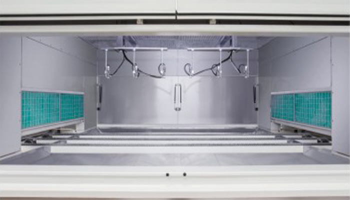 寬體雙臂自動(dòng)噴涂室:鏈條輸送方式,變頻調(diào)速;一字噴槍排布;配光電掃描,控制噴槍的啟停動(dòng)作。平整垂直的噴涂室,貼防護(hù)膜更容易。